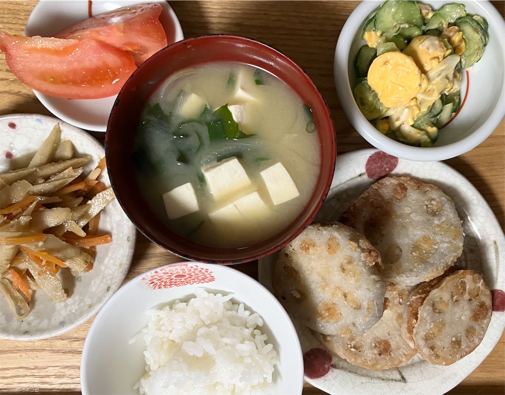 蓮根のはさみ揚げ・きんぴらごぼう・味噌汁・サラダ・トマトでした。鶏ひき肉に、玉ねぎと厚揚げのみじん切りを加え、味付けして、蓮根に挟みました。「はんぺんより、豆腐の方が美味しい。」と、娘が言いました。これからは、混ぜる時は、厚揚げにします。厚揚げの方が、ひき肉に馴染んでいます。シュウマイも、これで作ります!はんぺんが、値上がりしたので、思いつきましたが、結果、美味しくなりました。きんぴらは、朝、作っておきました。御飯を食べている時、「うちのご飯、ますます、ヘルシーになってるね。」と、娘が言いました。肉も魚も高いので、豆腐や大豆が活躍していますが・・それでも、かかる食費は、平均並みなので、「みんな、どうしてるんだろうね~。」と、話しました。節約を意識しても、そんなに変わらない気がします(外食は含みません。)私は、お惣菜や冷凍食品を買わない分、週末のおやつは、好きなものを買ってます。「それくらは、いいいよね。」と、娘と話しました。好みの食事で、元気になりましょう( ´ ▽ ` )
